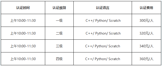 1-4级认证时间为上午9:30-11:30,5-8级认证时间为下午13:30-16:30。4月18日17:00开启6月认证报名通道,考生可登录GESP官网进行报名。