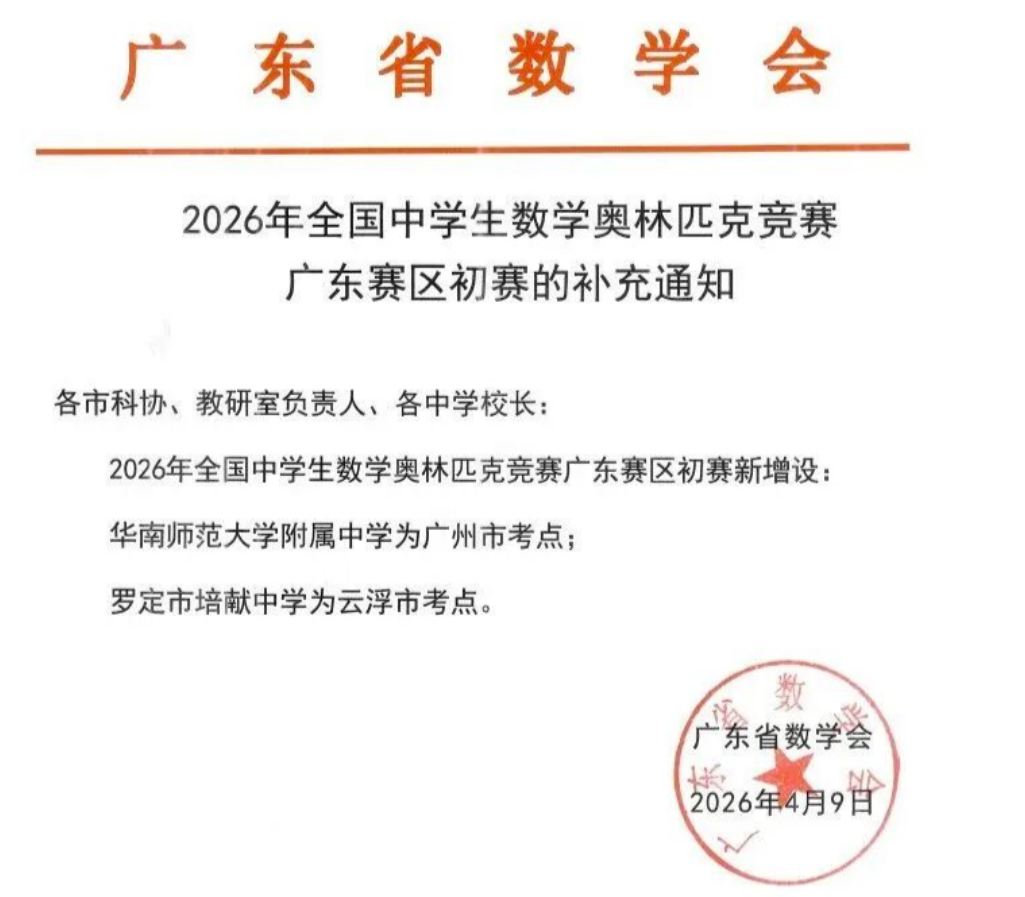 2026年中学生数学竞赛广东初赛补充通知发布,新增华南师范大学附属中学、罗定市培献中学两处考点!