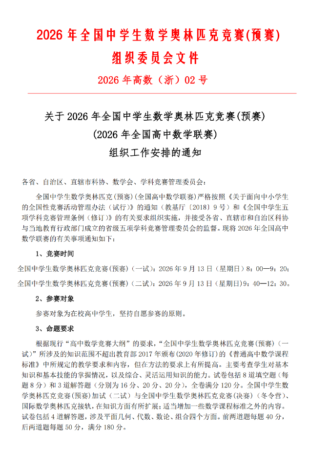 2026年全国中学生数学奥林匹克竞赛(预赛)安排通知正式发布,包含竞赛时间、参赛对象、命题要求、考试相关内容等详细安排,一起来看。