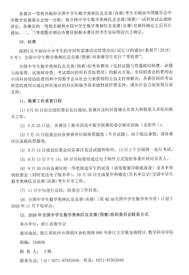 2026年全国中学生数学奥林匹克竞赛(预赛)安排通知,9月13日开考