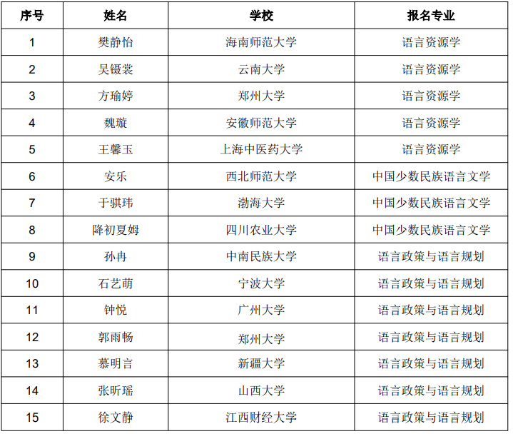 北京语言大学语言科学院全国优秀大学生夏令营优秀营员名单