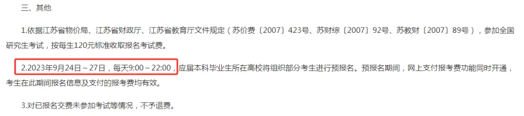 在《江苏省2024年全国硕士研究生招生考试报名工作的通知》中,规定,2023年9月24日~27日,每天9:00~22:00,应届本科毕业生所在高校将组织部分考生进行预报名。