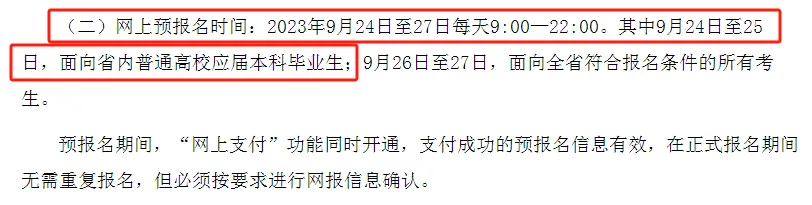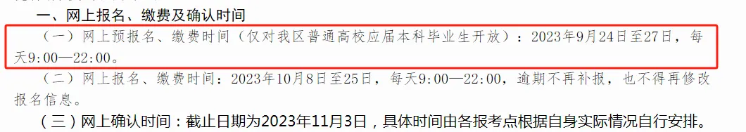 网上预报名、缴费时间(仅对我区普通高校应届本科毕业生开放):2023年9月24日至27日