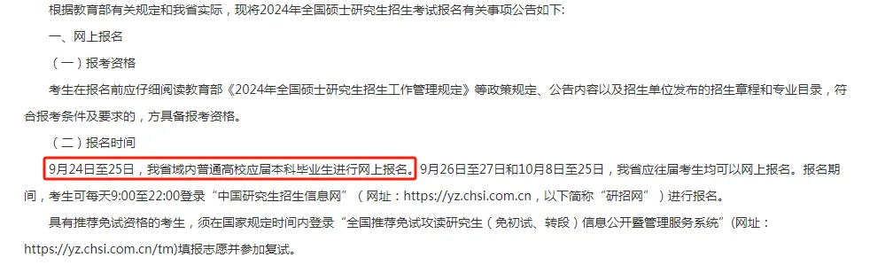 网上预报名时间:2023年9月24日至27日每天9:00-22:00,其中9月24日至25日,面向省内普通高校应届本科毕业生。