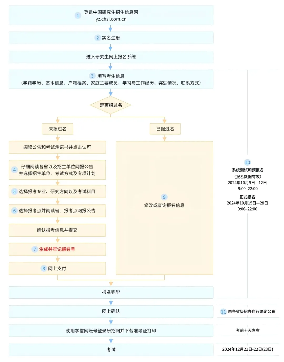 一、全国硕士研究生招生考试报名包括网上报名和网上确认两个阶段。其中,网上报名时间为2024年10月15日至10月28日(网上预报名时间为2024年10月9日至10月12日,相关工作安排由各省级教育招生考试机构确定并公布),每日9:00~22:00。网上确认时间由各省级教育招生考试机构确定并公布。