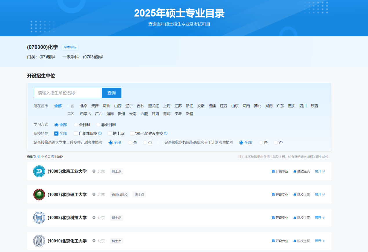 点击目标专业对应的“开设院校”,系统将展示所有开设该专业的招生单位列表,并支持按照招生单位所在省市、院校特性等条件进行筛选。