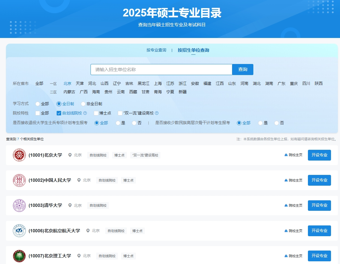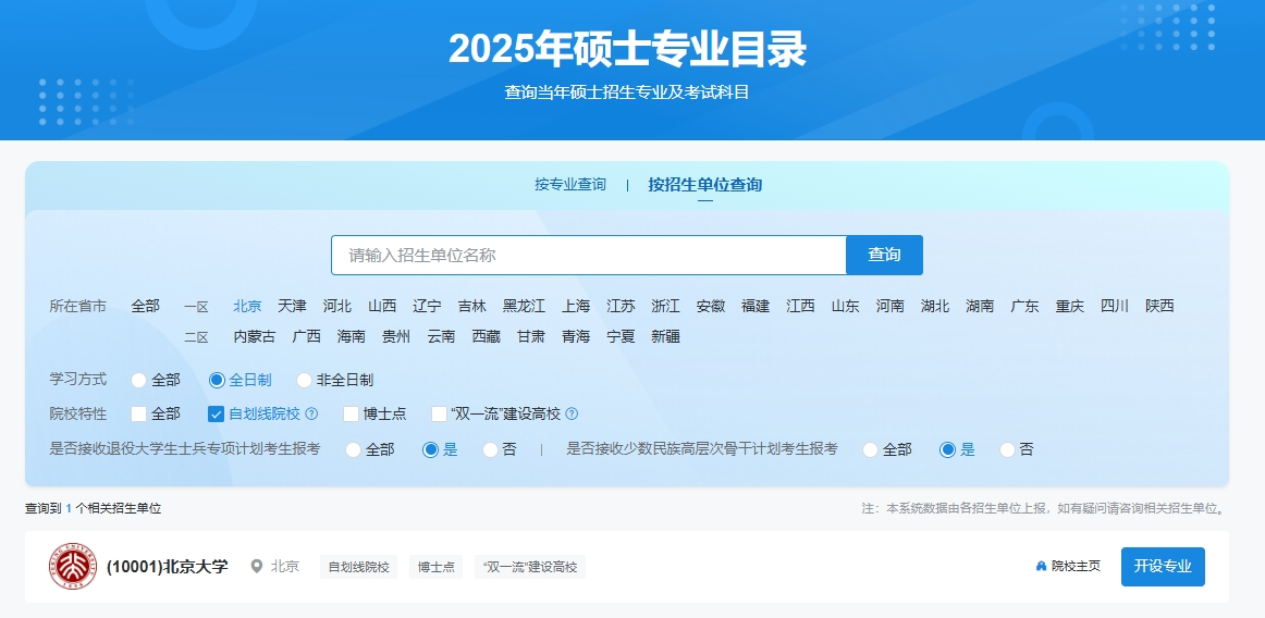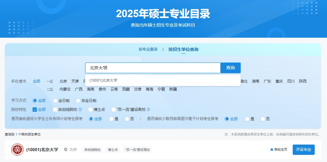 2025年硕士专业目录查询方式更加灵活,支持按专业、按招生单位两种方式查询。