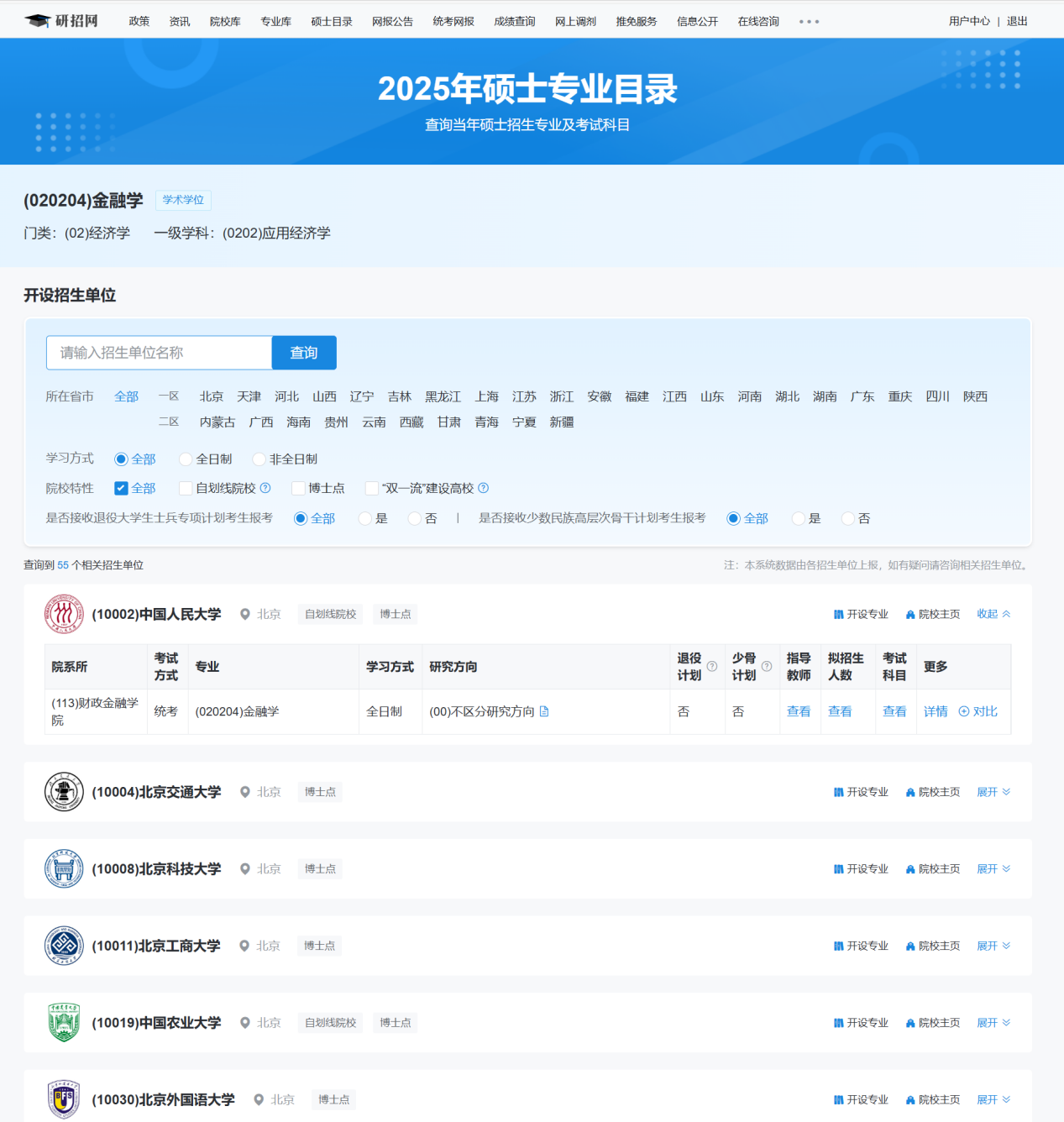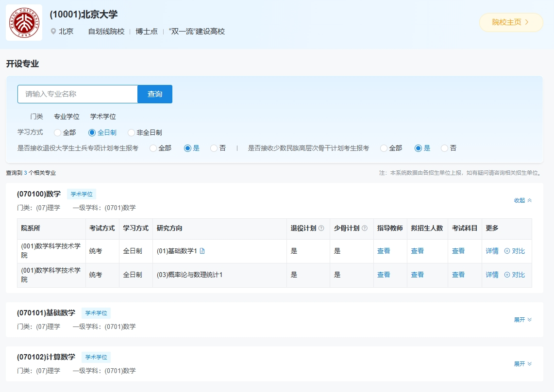 点击“展开”可查看招生单位的开设专业详情,包括但不限于院系所、考试方式、专业、学习方式、研究方向、拟招生人数、考试科目等。