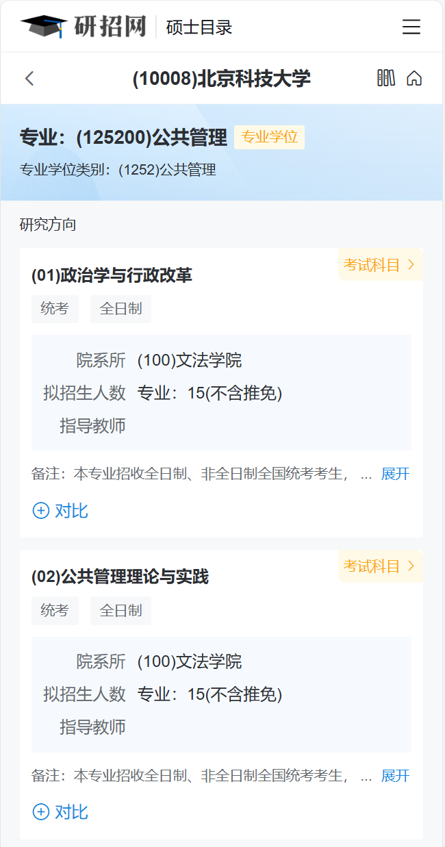 点击“展开”可查看招生单位关于目标专业的开设详情,包括院系所、考试方式、专业、学习方式、研究方向、拟招生人数、考试科目等。
