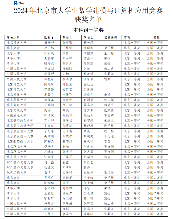 北京市大学生数学建模与计算机应用竞赛获奖名单
