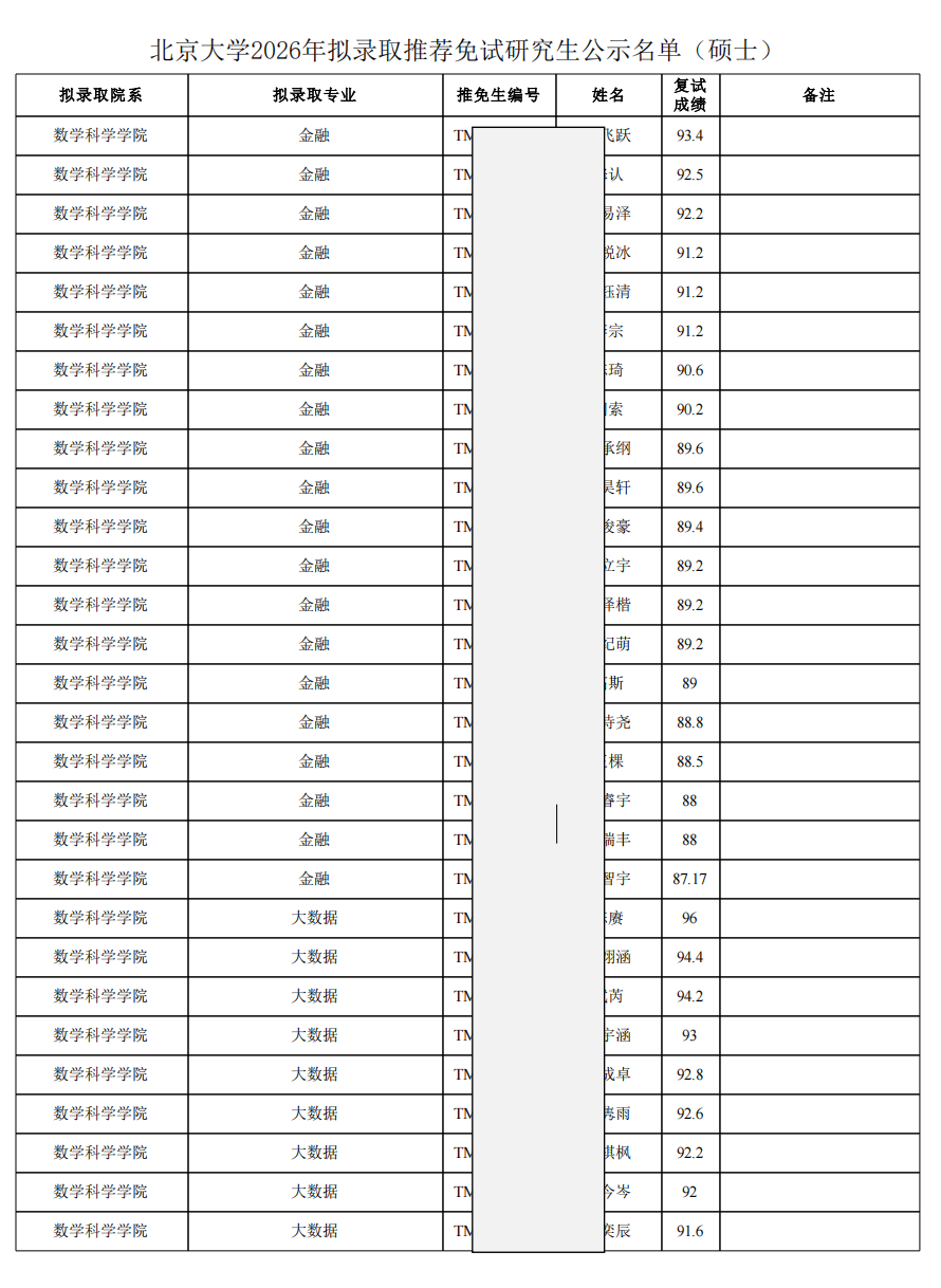 因内容较多只展示部分,完整名单附件查看:北京大学2026年推免研究生拟录取名单