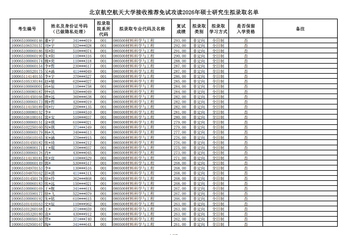 根据教育部、北京市相关文件要求,经各单位研究生招生工作小组审核,现将北京航空航天大学接收推荐免试攻读2026年研究生拟录取名单进行统一公示。此名单为拟录取名单,须上报北京教育考试院和教育部审核。凡参加全国统考、未按要求交送所需相关材料、2026年入学报到前未取得国家承认的本科毕业证书或者弄虚作假一经查实的考生,其录取资格无效。