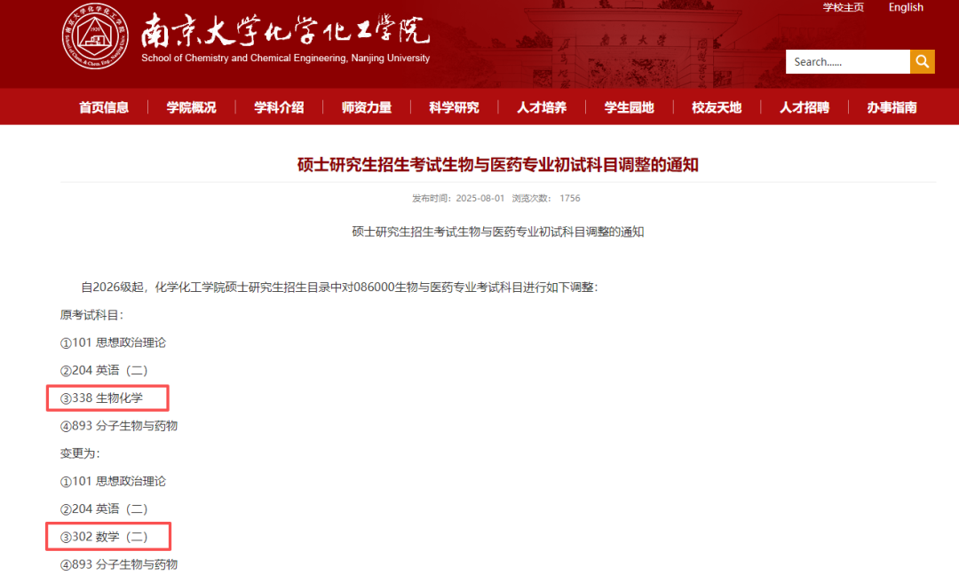 据高校研招网通知,南京大学、东北林业大学、青岛科技大学等高校的生物与医药专业,将数学(二)统考科目纳入初试科目,取消一门专业课考试。而同济大学的生物学、中国石油大学(华东)的生物技术与工程,亦有相同的科目调整。