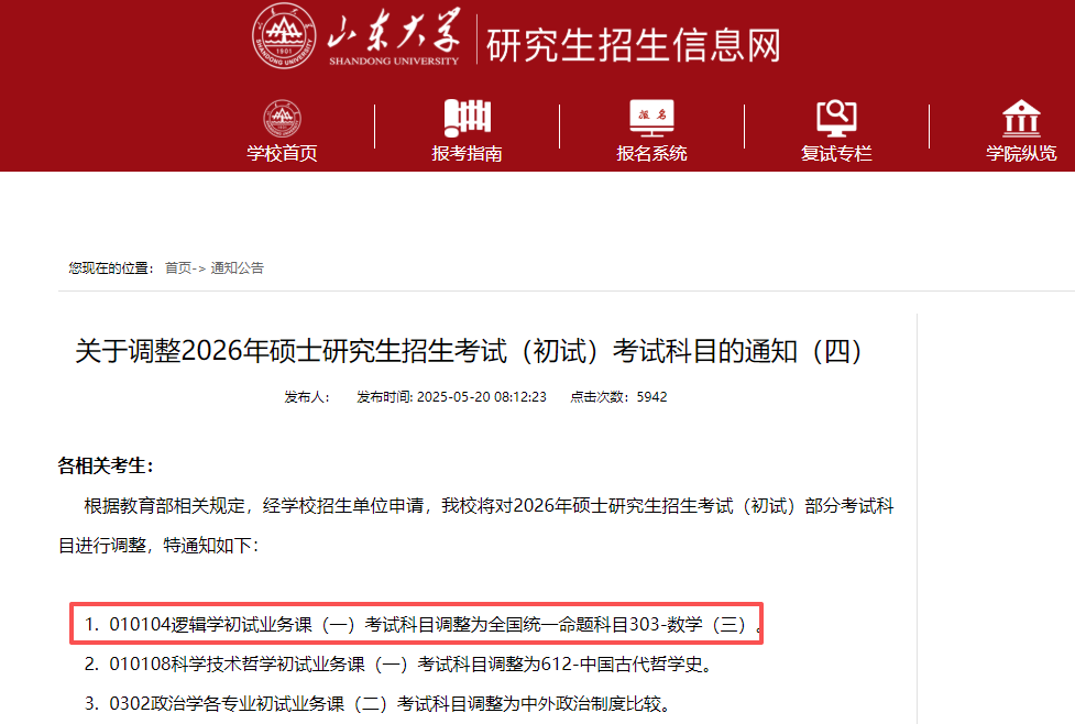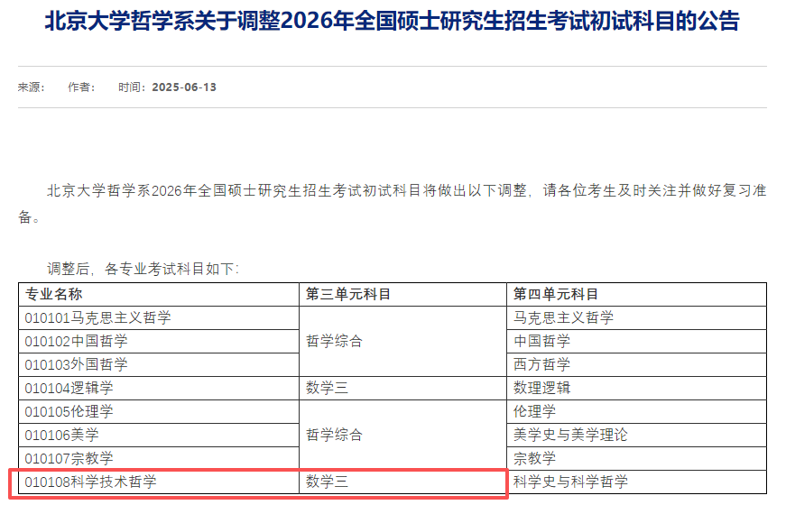 2026年,一些文理交叉的文科专业增加了数学初试科目。985名校率先进行调整。在哲学类专业中,北京大学哲学系的科学技术哲学,第三单元科目由科学技术史调整为数学(三);山东大学逻辑学初试业务课(一)考试科目调整为303数学(三)。