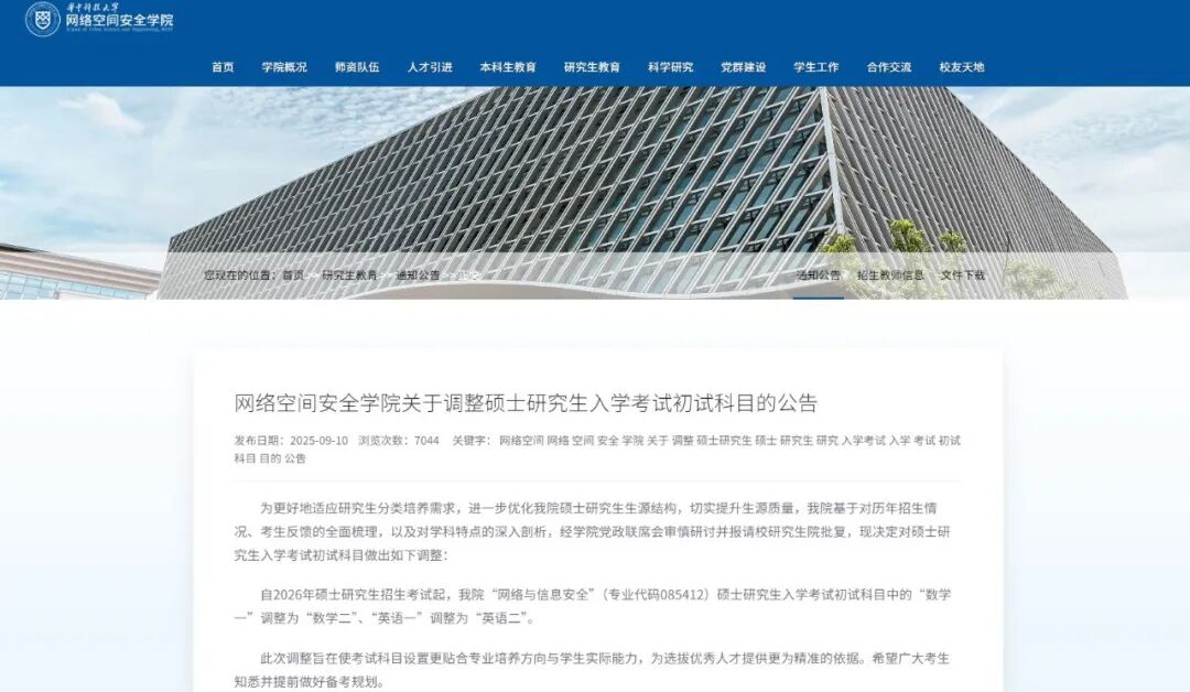 不过,也有少数高校降低了数学科目的考试难度。华中科技大学网络空间安全学院宣布,为更好地适应研究生分类培养需求,进一步优化硕士研究生生源结构,切实提升生源质量,自2026年硕士研究生招生考试起,网络与信息安全的初试科目数学(一)调整为数学(二)、英语(一)调整为英语(二)。