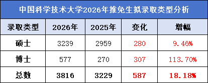 中国科学技术大学2026年拟录取硕博生共3816人,比去年增加587人,增幅18.18%。其中硕士增加280人,直博生增加307人,增幅高达113.70%。