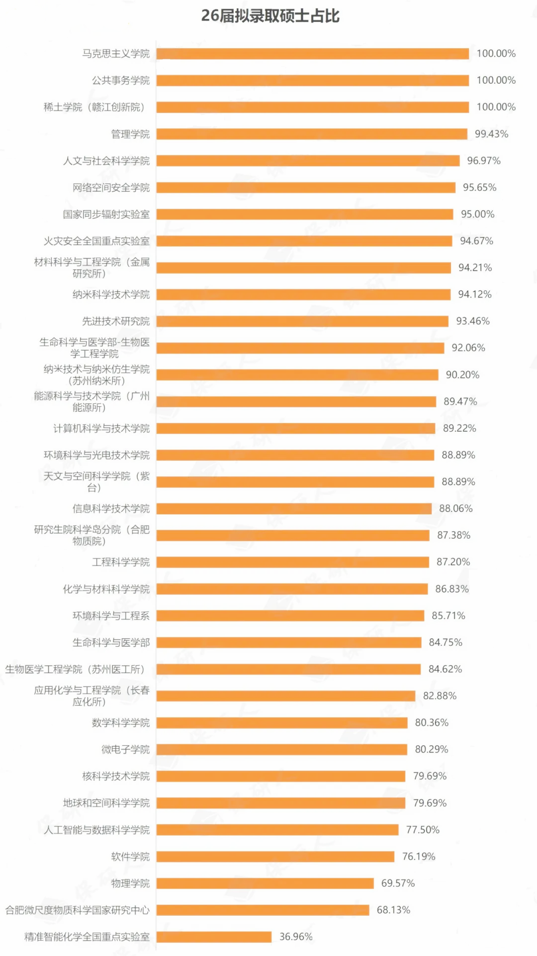 34个招生单位均接收推免硕士生,整体来看,27个招生单位的硕士占比都在80%以上,其中,马克思主义学院、公共事务学院、稀土学院(赣江创新院)3个院系硕士占比100%;而精准智能化学全国重点实验室的硕士占比最低,仅为36.96%。