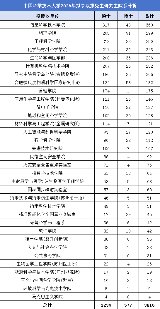 中国科大2026届共有34个院系招收推免生,其中信息科学技术学院招生人数最多,拟录取360人;物理学院、工程科学学院、化学与材料科学学院、生命科学与医学部、计算机科学与技术学院、研究生院科学岛分院(合肥物质院)招生人数都在200人以上。
