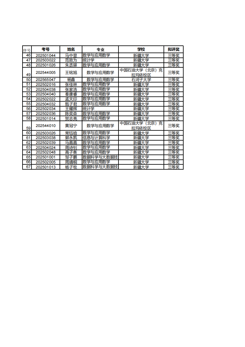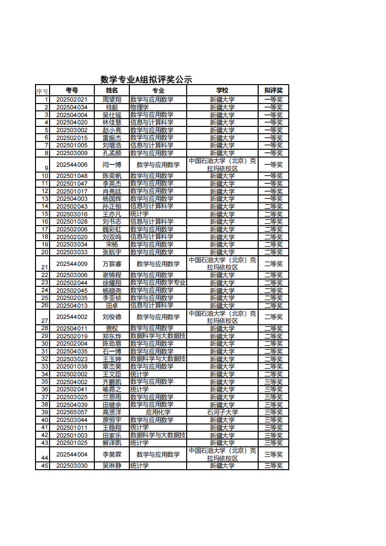 2025年第十七届全国大学生数学竞赛新疆赛区获奖名单