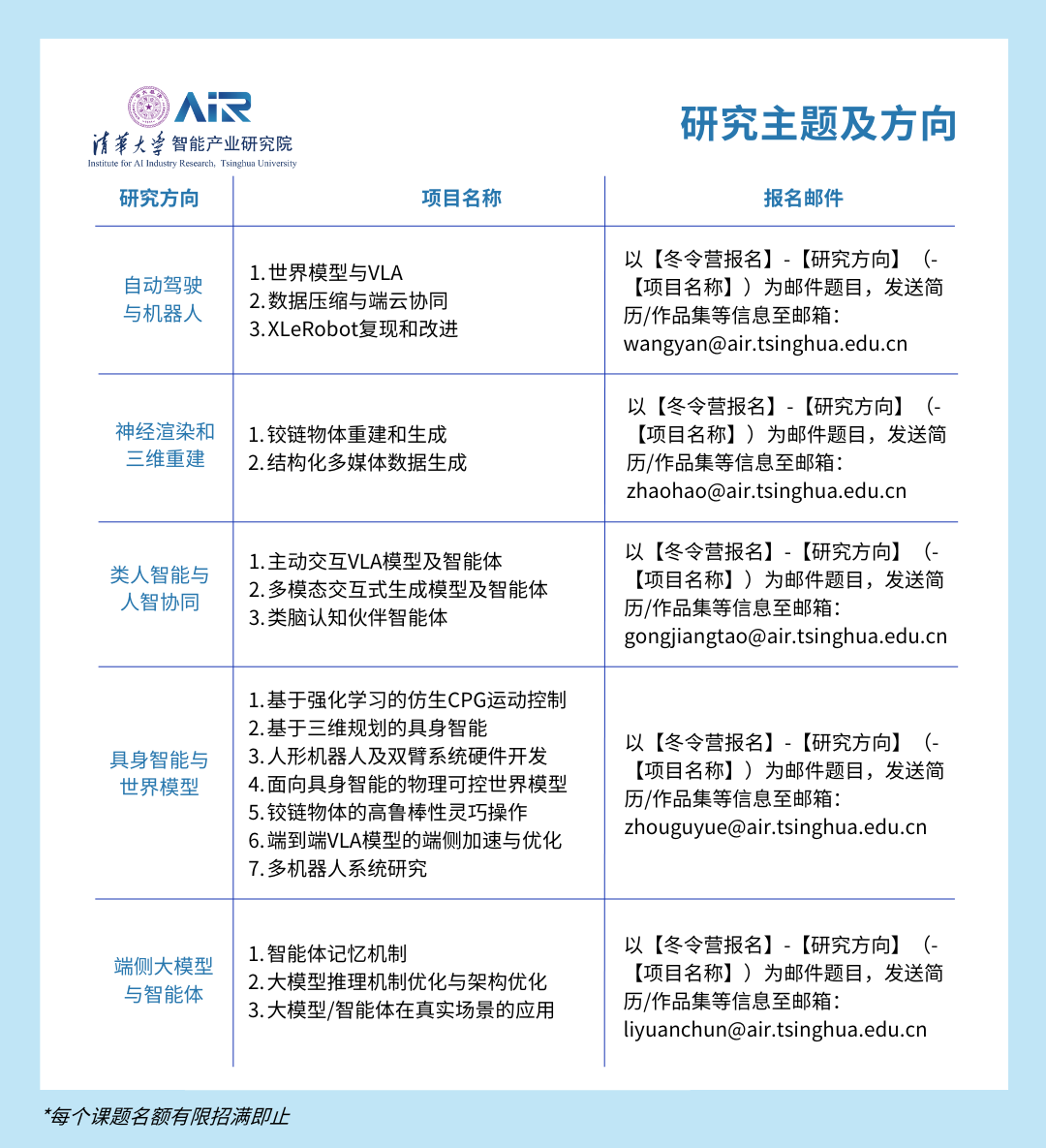 刚!清华大学智能产业研究院(AIR)2026冬令营报名开启!报名要求:电子工程、自动化、计算机、人机交互、设计学、心理学等方向的相关专业的研究生/本科高年级海内外知名院校在校生。冬令营期间至少保证有1-2个月的线下工作时间。自主选拔在线团队整理清华大学智能产业研究院(AIR)2026冬令营报名通知相关内容,以便考生参考!