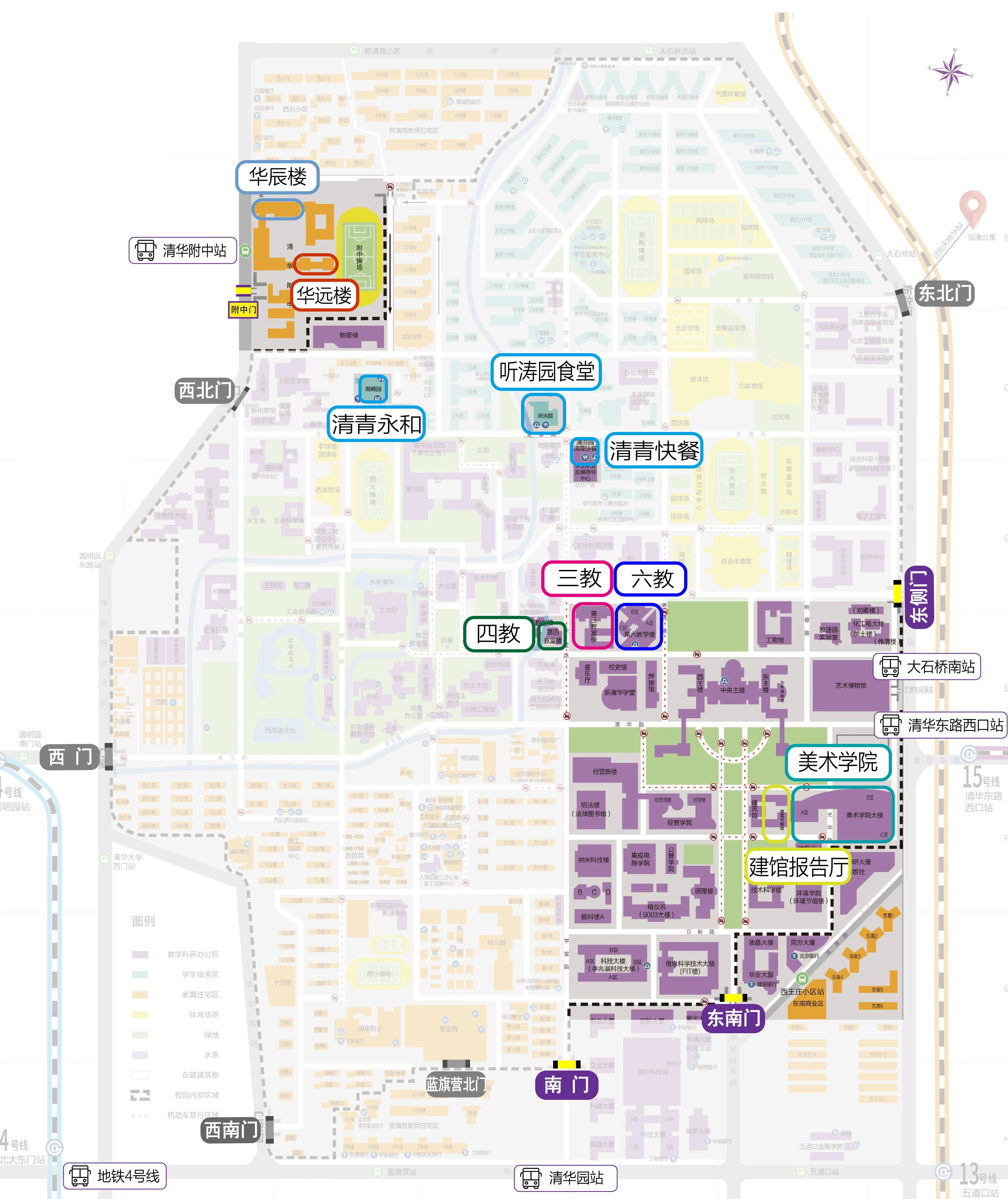 ①考试地点在清华大学校内四教、六教、美术学院的考生:学校的各个门均可入校和出校,其中东南门、东侧门和南门距离考场相对较近(步行约20分钟)。清华大学东南门临近双清路和华业大厦,东侧门临近荷清路和清华大学艺术博物馆,南门临近中关村东路和文津酒店。