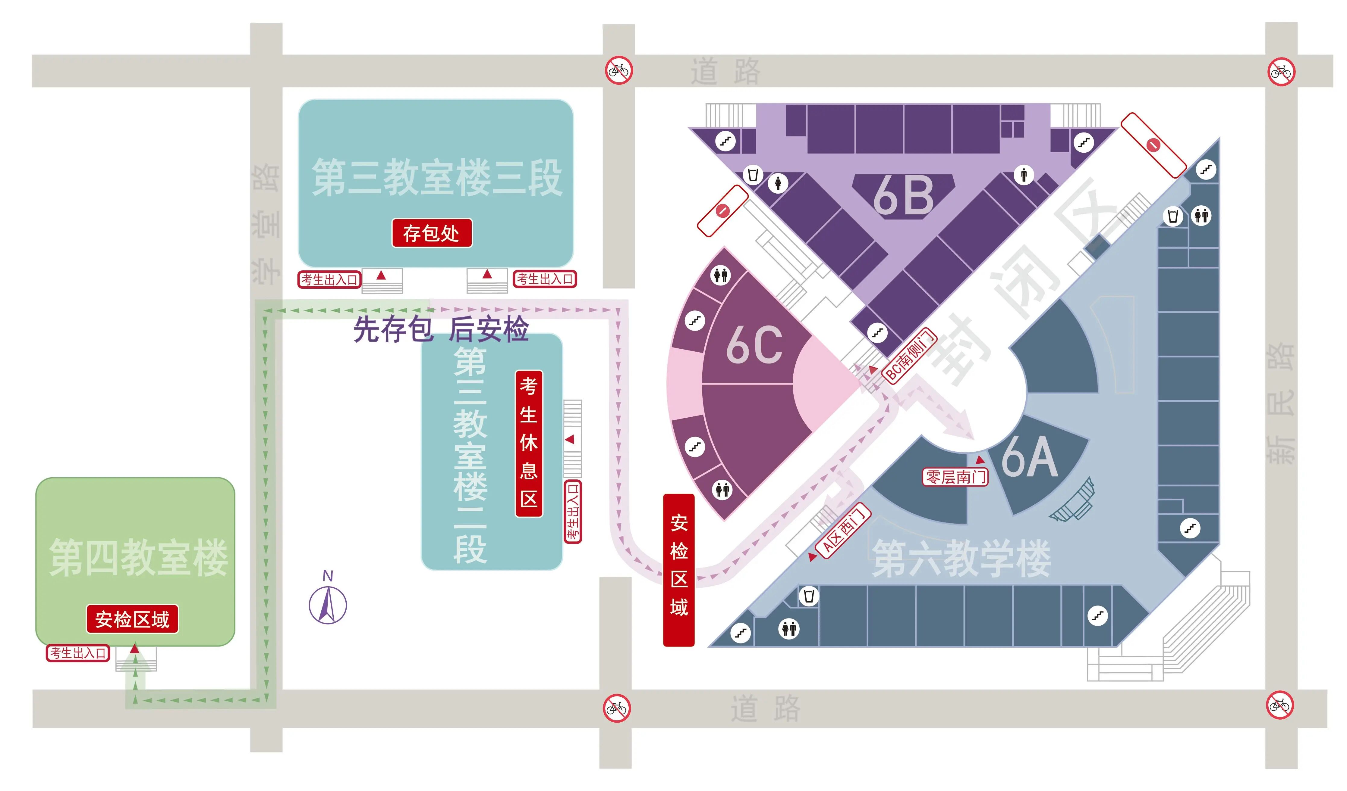 四教、六教的楼门开放时间均为上午7:30,下午13:00。存包处为三教三段,安检通道和考场楼入口分别如图4所示。