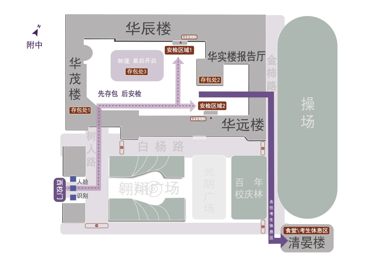 ②考试地点在清华附中的考生:唯一入校和出校通道——清华附中西校门(地址为北京市海淀区中关村大街清华大学北侧,西校门临近中关村北大街和清华附中公交站)。