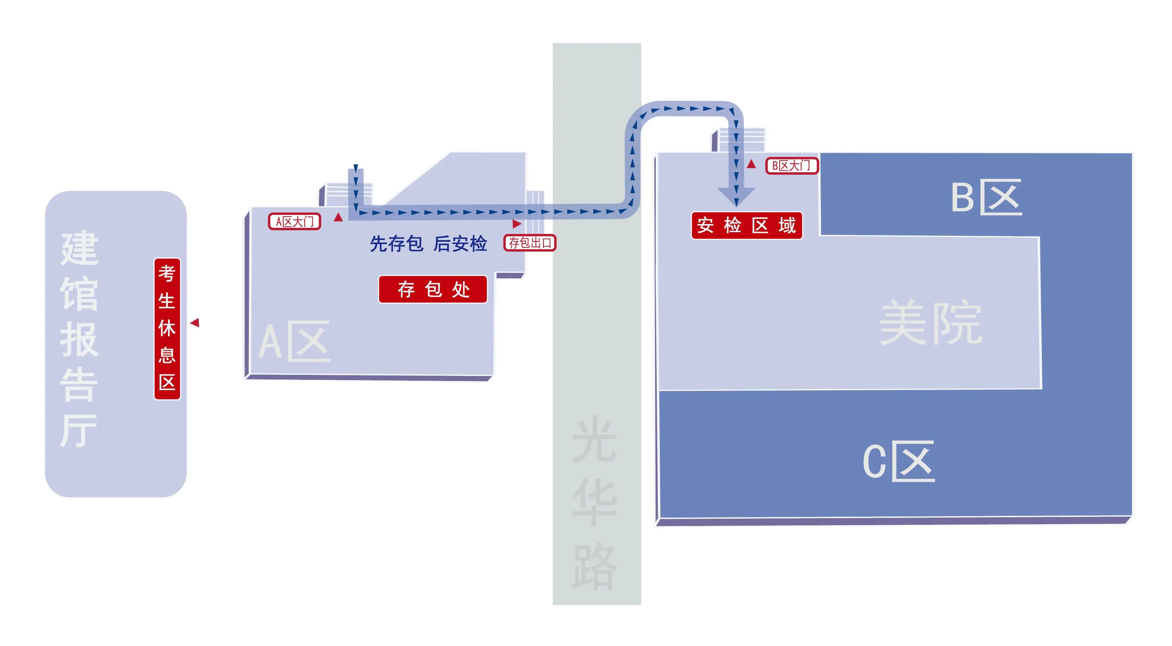 美术学院的楼门开放时间为上午7:30,下午13:00。存包处为美术学院A区,安检通道和考场楼入口分别如图5所示。