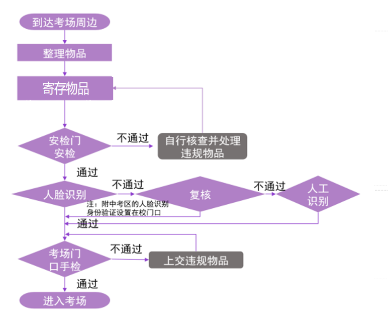 按照要求今年研考入场安检实行智能安检、人脸识别、金属探测等核查方式,考生入校后须提前在考场安检区外的存包处存放个人物品。考虑到存包及入场查验需要、考生入校后距离考场楼较远,请考生预留充足时间。入校后只能步行或骑车,请根据现场工作人员的指挥停放自行车。