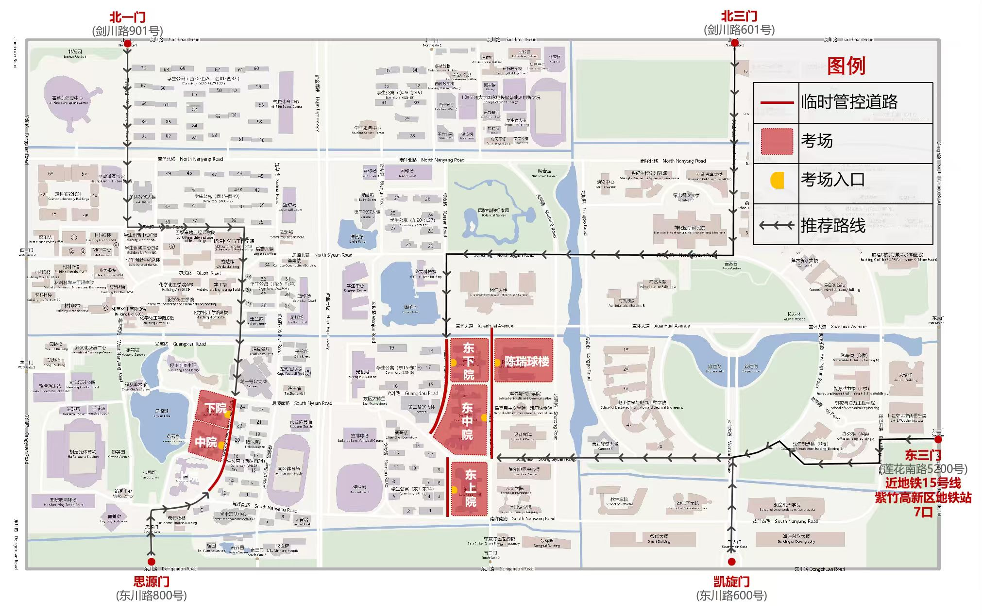 2.考场在下院、中院的考生请就近从思源门(东川路800号)或北一门(剑川路901号)进校;考场在东上院、东中院、东下院和陈瑞球楼的考生请就近从凯旋门(东川路600号)进校。