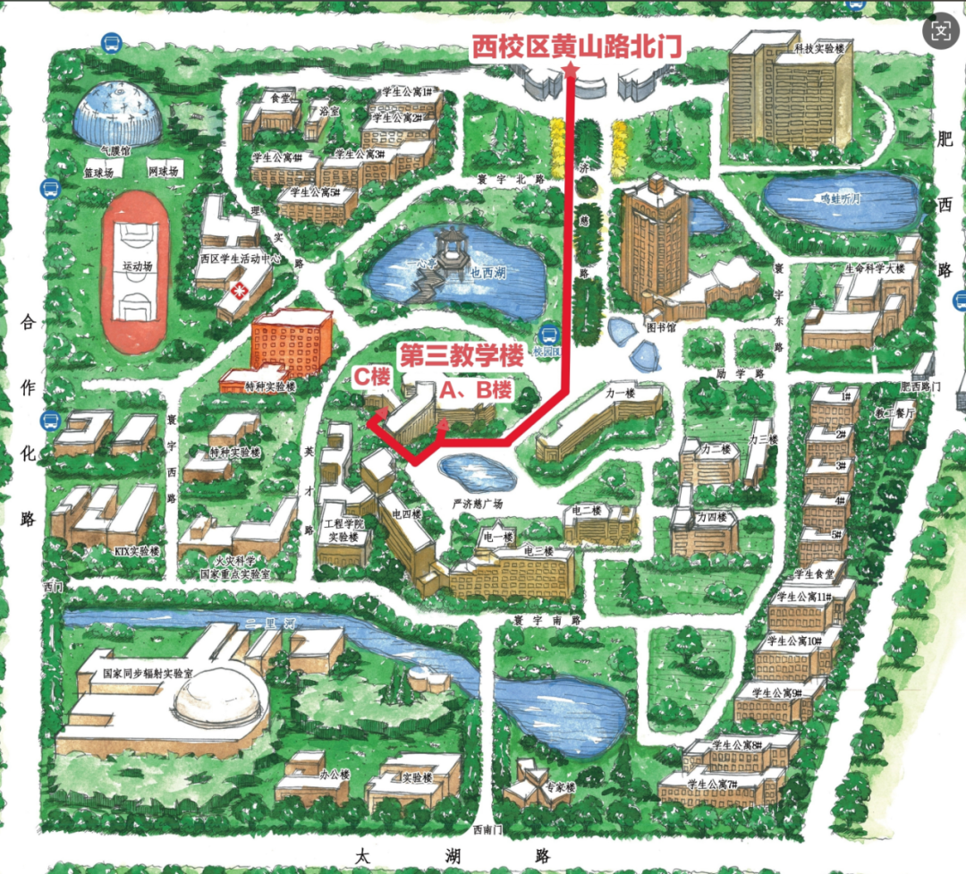 考试当天,所有考生上午7:00起可凭准考证、有效居民身份证件进入中国科学技术大学西校区校园(校外考生须从黄山路北大门进入,车辆谢绝入校,中国科学技术大学在校生可乘坐校园巴士或凭一卡通从各校门进入)。从黄山路北大门进入校园后,考生应沿专用路线(见附图,步行约5分钟)进入第三教学楼A楼考点、C楼考点。