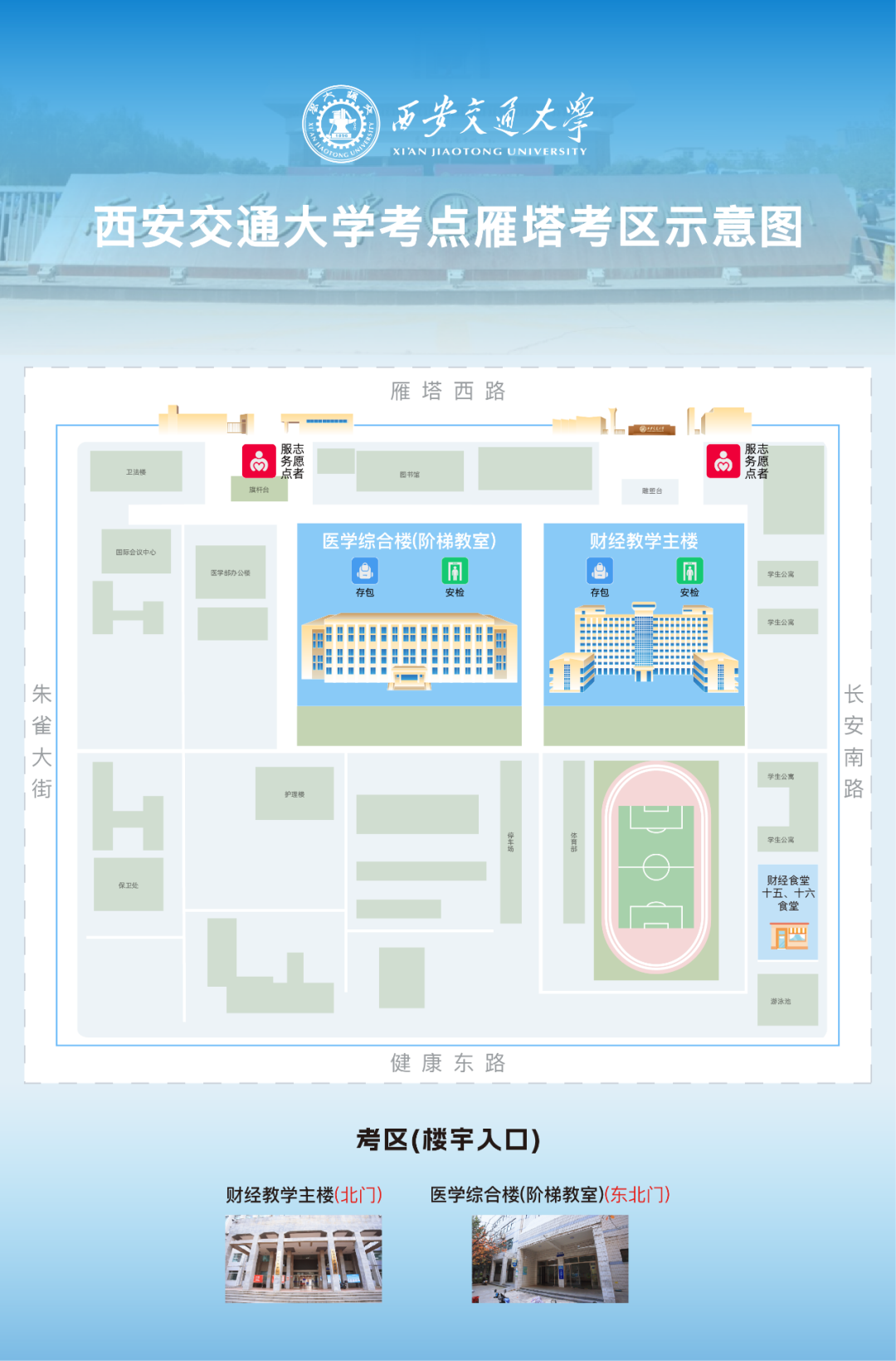 雁塔考区位于西安市雁塔区雁塔西路74号,考试期间开放经金北门、医学北门、医学西门等校门;设立财经教学主楼、医学综合楼等教学楼及周边区域作为考试楼群,雁塔考区示意图如下: