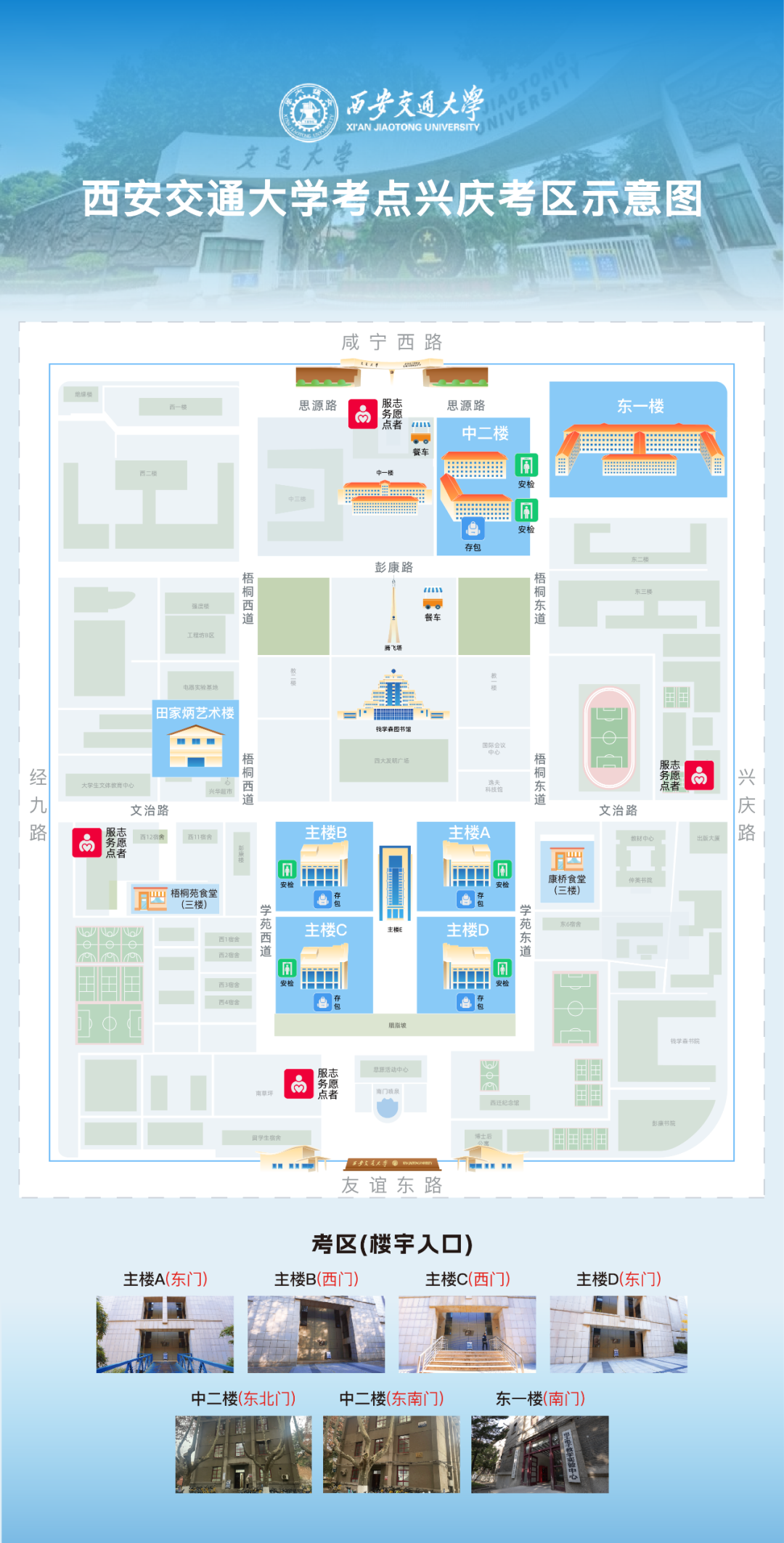 兴庆考区位于西安市碑林区咸宁西路28号,考试期间开放北门、南门、西南门、东南门等校门;设立主楼(A、B、C、D座)、中二楼、东一楼、田家炳艺术中心等教学楼及周边区域作为考试楼群,兴庆考区示意图如下: