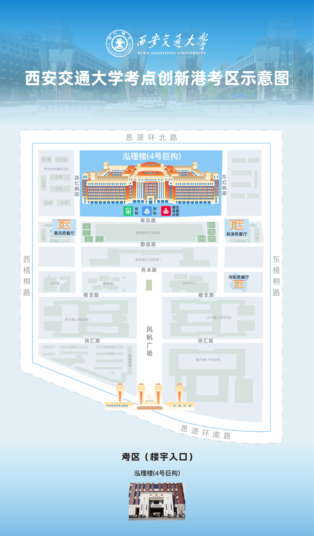 创新港考区位于西安市长安区高桥街道中国西部科技创新港,设立泓理楼(4号楼)及周边区域作为考试楼群,创新港考区示意图如下: