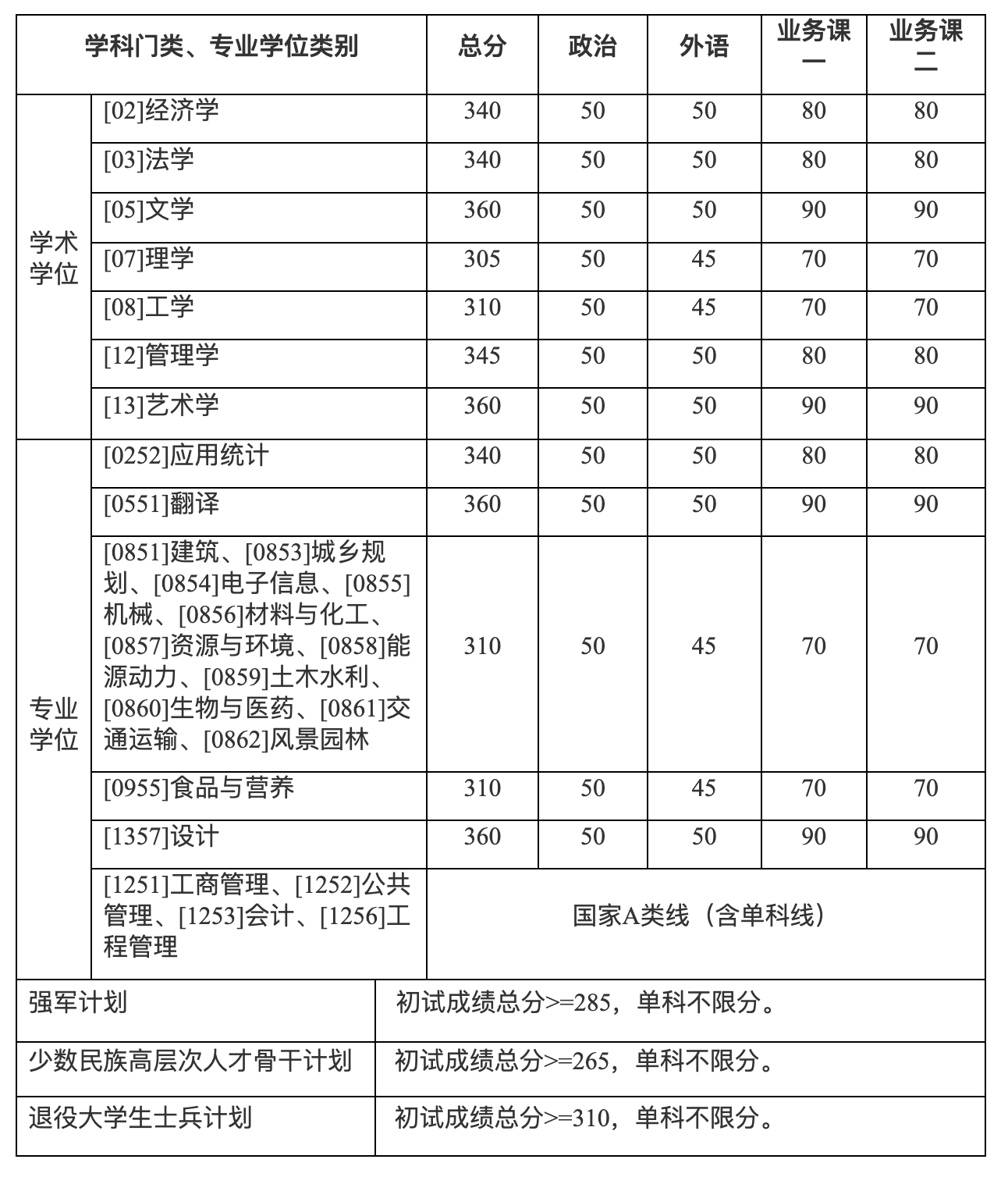 (3)退役大学生士兵计划:按照考生初试总分与相应学科复试资格线总分的差值从高到低排序决定是否获得复试资格,“差值”相同时优先理工科专业,同等条件下服役时间长的考生优先,如报考专业和服役时间均相同,再按初试前三科成绩加和排序,直至达到总招生计划数。若复试期间出现考生资格审查不通过、放弃复试资格、复试不合格等情况,依据遴选规则依次递补复试。