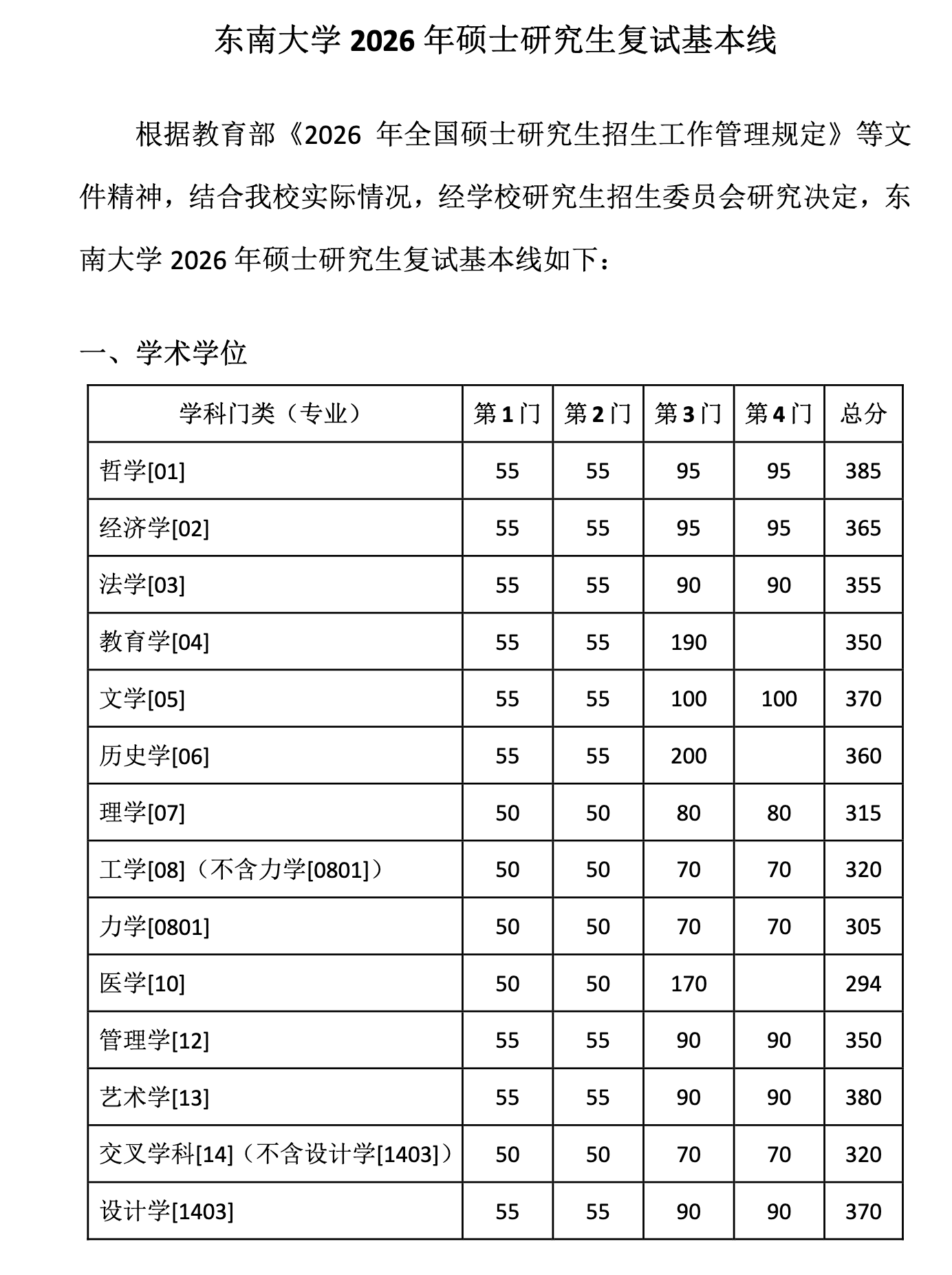 东南大学2026年硕士研究生复试基本线