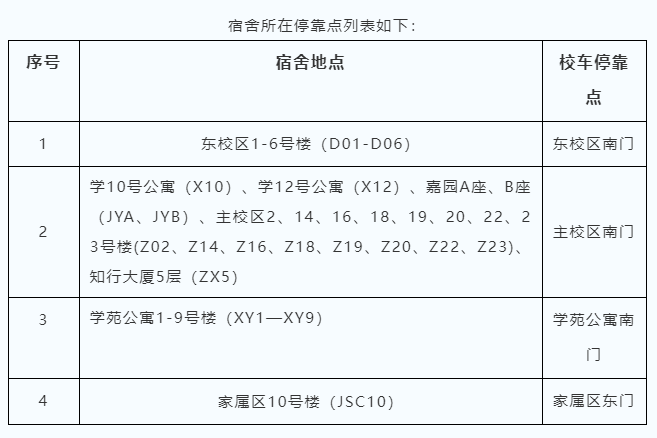 校车在主校区、东校区及各公寓等地设有停靠点。学生在宿舍所在停靠点下车,持录取通知书、身份证进入校园,前往宿舍办理现场报到并领取一卡通。学生家属根据前期在迎新系统中报备的信息刷身份证入校。