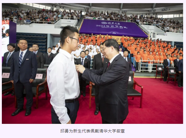 典礼上举行了新生佩戴清华大学徽章仪式,邱勇为新生代表戴上了清华大学徽章。胸前闪耀的校徽,是肩上责任,是心中理想,更让每一位新“清华人”脚下充满力量。他们将“自强不息、厚德载物”的清华校训铭记在心,把青春融入党和人民事业,向着奋进之路、逐梦之旅出发。