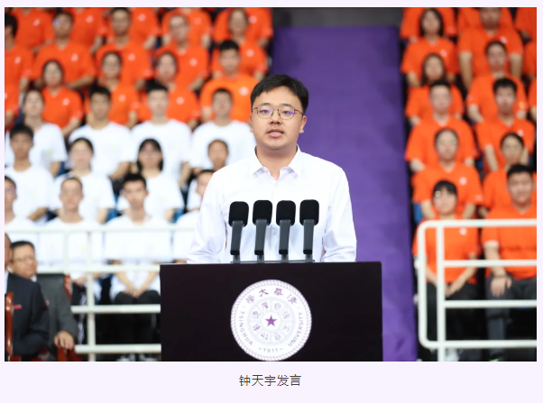 校学生会主席钟天宇代表全体在校生发言。他以纯真、纯正、纯粹三个关键词,回忆了四年大学生活里令他最为难忘的珍贵友谊、优良学风和赤诚爱国之心。希望学弟学妹们能在交往中践行纯真,在求学时体会纯正,在事业上追求纯粹。
