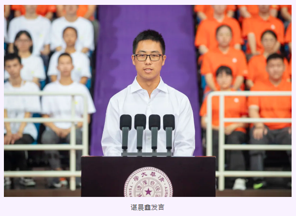 新雅书院2024级本科生谌晨鑫代表新生发言。他期待在未来的大学时光里,能在学校广阔的舞台上发现自我,在集体主义的氛围中追求大我,努力践行爱国奉献、追求卓越的清华精神,为强国建设、民族复兴贡献力量。