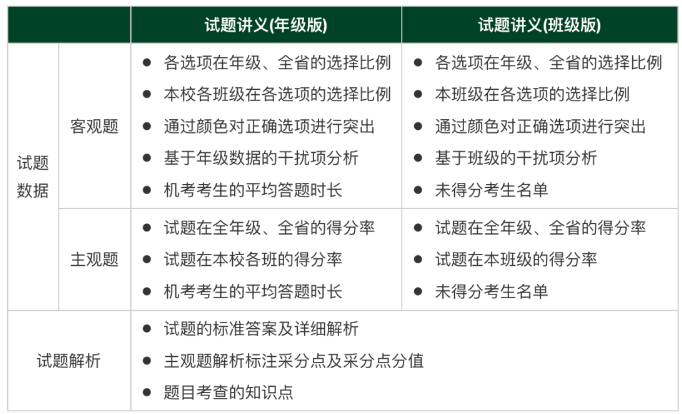 学科试题讲义按使用场景和角色分为年级版和班级版两种版本。两种版本的讲义对于每道题均包含试题数据和试题解析两个部分。学科试题讲义分两次发布:考试当天内发布初版讲义,包含完整的试题解析和客观题的试题数据;阅卷结束后,与考试成绩数据共同发布完整讲义,补全试题数据中的主观题试题数据。试题讲义的内容如下表所示。