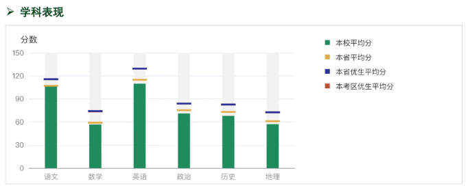 学科平均表现:呈现各学科平均分及本校平均分相对于本省考生平均分、本身优生平均分和全国优生平均分的相对位置,让年级主任明确本校学科优劣势。