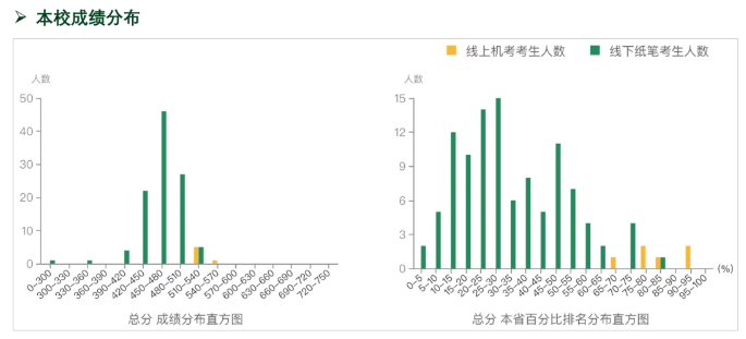 成绩分布:呈现“纸笔”和“机考”两类考生总成绩和各学科的成绩分布,让年级主任直观地了解本校成绩的整体集中度和差异度,及两类考生的差异程度。