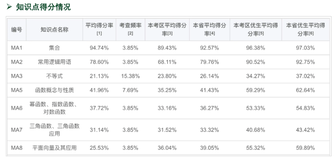 知识点表现概况:呈现各知识点本校平均得分率、考查频率、及全国和本省范围的整体或优生平均得分率,让学科组长明确学科知识点优劣势和教学重点。