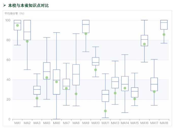 知识点表现对比:呈现代表各学科知识点下本省各中学平均得分率分布的箱型图及本校平均得分率在箱型图的相对位置,让学科组长从知识点视角了解科目优劣势。