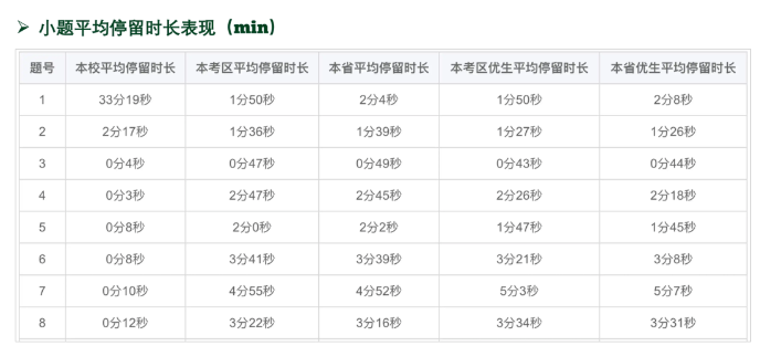 作答时长:呈现线上机考考生作答时在各题作答界面的停留时长(可近似看作答题时长),让学科组长了解学生作答时长分配从而识别学生作答策略问题。