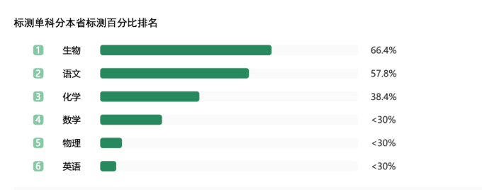 标测单科分本省标测百分比排名:该部分各科百分比排名可看作预测高考单科分省内百分比排名,是将当次考试各科分数放入TDA预测模型中得到的省内百分比排名预测值。