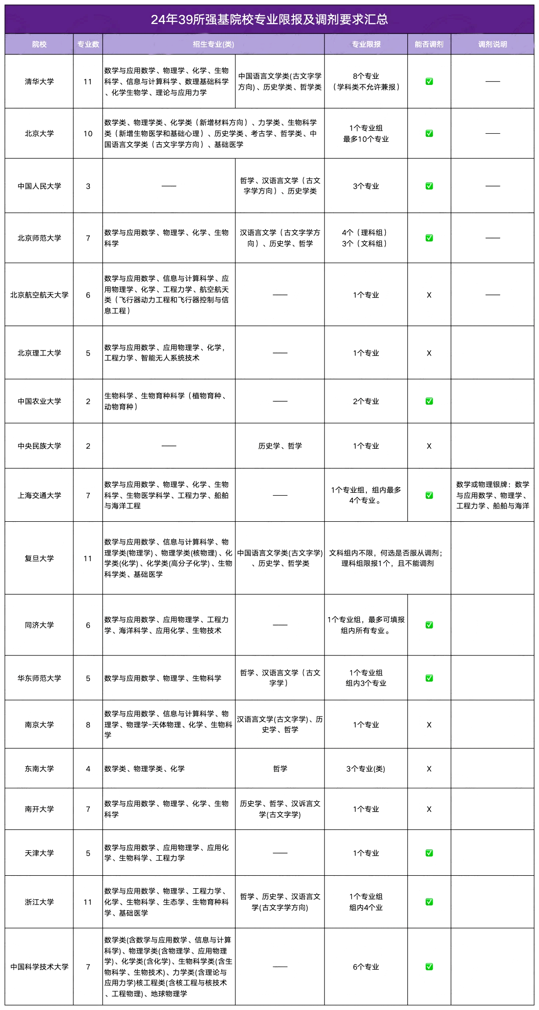 综上所述,24年强基院校在专业限报及是否服从调剂方面的具体要求汇总如下,考生需仔细查阅并根据自身情况做出合理选择。