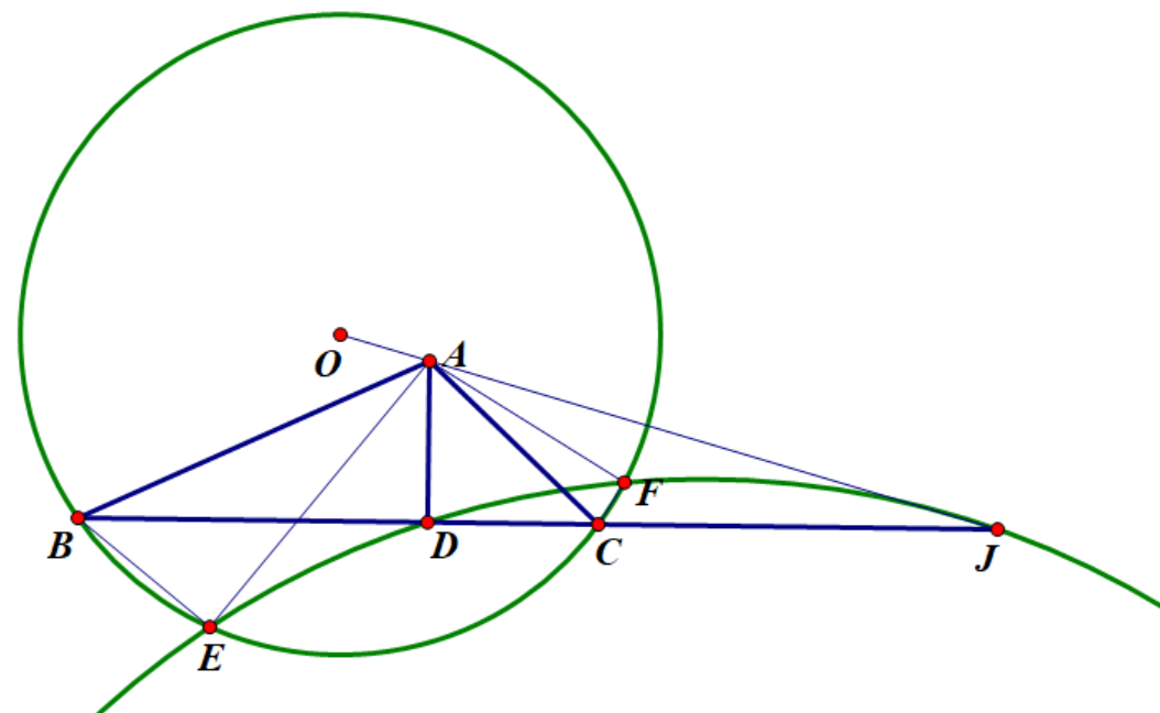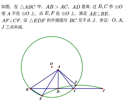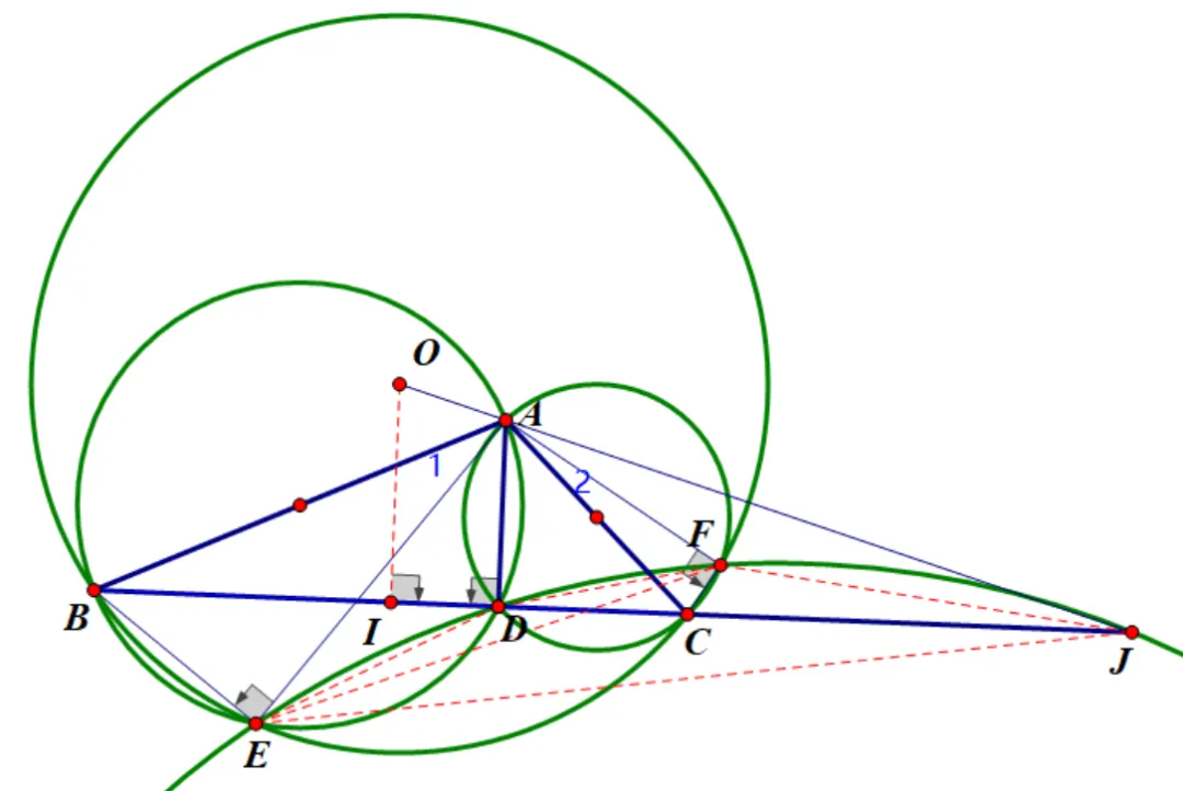 第三步,从结果入手,需证OAJ共线,点A算是基本点,点J满足EDFJ共圆,实在不行就用三弦定理算出DJ。点O也不太描述,最基本的想法就是用BECF中两边中垂线交点来描述。