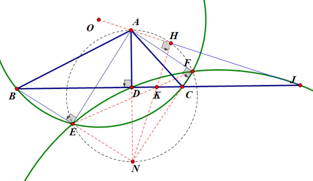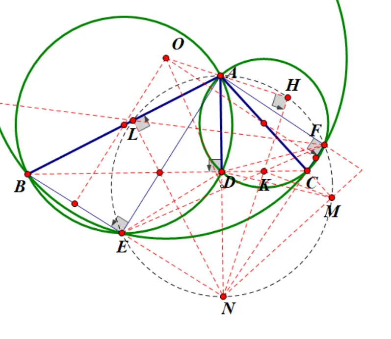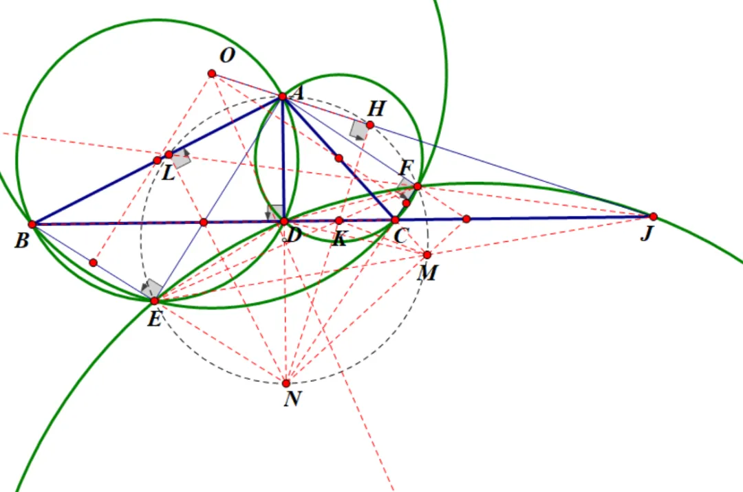 则ALEF共圆,同理AC和JE交点M也在此圆上。进一步,BE和FC交点N也在此圆上,且AN为此圆直径。这个圆应该很有用。进而还会有NL,AE,BC三线共点。还有NK与AJ交点H也在以AN为直径的圆上,这个可以通过相交弦定理证明。